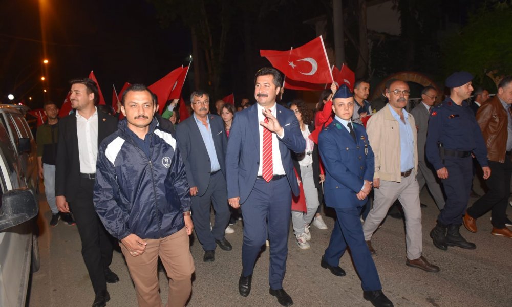 Yenişehir’de kutlamalar gün boyu devam ederken gece saatlerinde ise coşku arttı. Fincan Kafe’nin önünden Millet Bahçesi’ne kadar bando eşliğinde kortejle yürüyüş gerçekleştirildi. Yürüyüşe, ilçe protokolünün yanı sıra binlerce Yenişehirli de katıldı. Millet Bahçesi’nde kurulan sahnede ilk olarak Yenişehir Belediyesi Halk Oyunları ekibi sahne aldı. Gecede coşku Mavi Düş Grubu’nun konseriyle tavan yaptı.